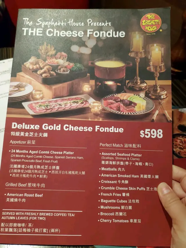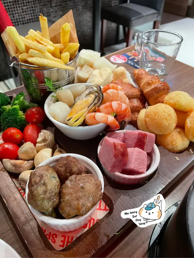 每年冬天都要同老公食一次,已經係指定動作。年年都差不多,不過今次要講吓!特級黃金芝士火鍋 $598法國康堤24個月 熟成芝士拼盤西班牙白毛豬風乾火腿西班牙風乾牛肉配鮮果野味燒牛肉滋味配料 種類很多雜錦海鮮拼盤(帶子、海蝦、青口)有肉丸,煙火腿, 薯條,鮮白菌,西蘭花,芝士泡芙,牛角包,法包粒, 車厘茄等……今年有d失望係有牛角包,覺得加落芝士火鍋味道怪怪地另外加$38要Star Potato配咖啡同茶或甜梅柚子梳打蜜點了一杯,但唔好飲,所以加😂$58改白酒一杯,老公就改配雪糕红豆冰加$26…查看更多