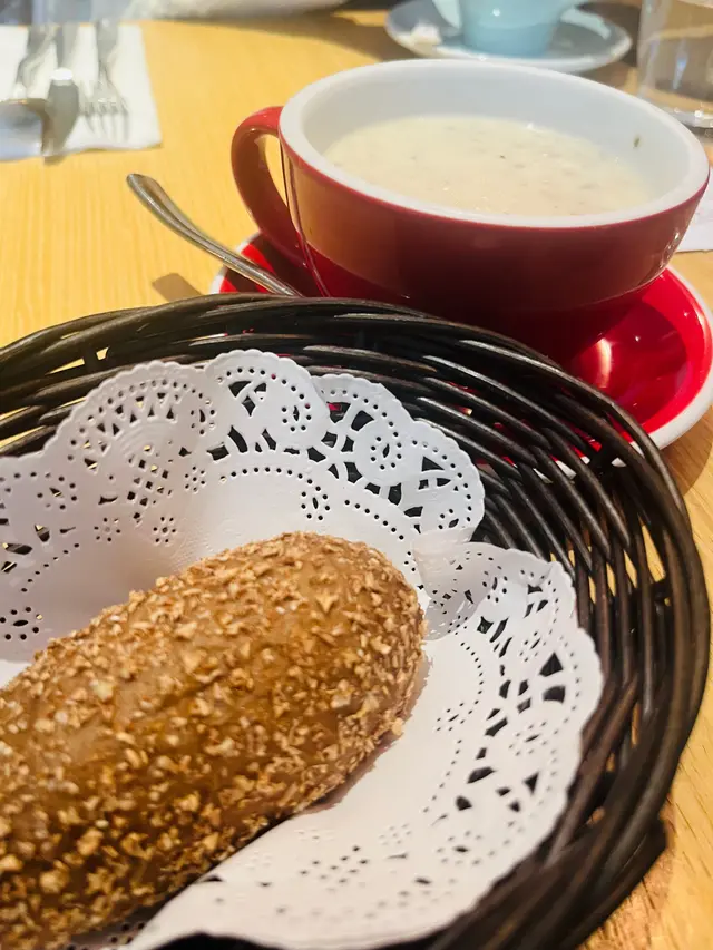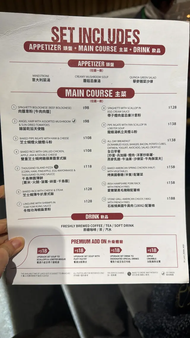 姐姐會喺排隊嘅時候叫你睇咗餐牌先臨入去先叫咗加快午餐速度,內容都係正常西餐,餐牌有飯有面有牛扒,百幾蚊係一個套餐有埋餐湯同嘢飲,喺港島區都算係咁