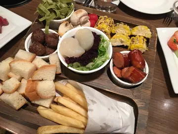 其实真的很久也不吃一次意粉屋。是因为大家想吃芝士火锅就决定吃这家了。最后我们7个人点了2个双城牛肉芝士火锅和1个传统芝士火锅头盘是干牛肉x三文鱼黑醋沙律。味道整体不错~三文鱼也很大的一块(不过貌相就差了点吧/ v \)芝士火锅的配料有这些。(牛肉那个忘记了拍照Orz 不过放在芝士火锅时有血水...感觉其实不太好w)众多配料中最喜欢的还是吃法包+香草包粒看上去的份量好像很少~不过我们还有吃剩/___\(但如果真的觉得不够是可以在套餐外加配料~)另外饮品有大Menu的买一送一优惠^^而且没有规定2杯是同一款饮品。…查看更多