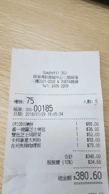 星期六办完点正经事和家人去了Spaghetti 360吃个午餐。看到这个酥Early餐牌说下午12:00前落单、12:45前结帐便有优惠价之同时,又看到另一午餐餐牌有令人为之动容的pizza,最后我们三人点了两个优惠餐和一个pizza午餐。先来的酥皮汤,香脆的酥皮内是热腾腾的白汁蘑菇汤。再来的是酥Early餐牌上的日式芝麻酱鸡肉1.7mm意大利粉 $52。芝麻酱通常配冷面或鸡丝粉皮,这次跟意粉的配搭也很新奇和美味。每条意粉都吸收了香浓的芝麻酱,加上许多的菇和鸡肉也带著芝麻酱独特的浓香,这个值得一试!之后是酥Early餐牌上的薄切肥牛蟹籽300C热石锅饭(日式烧汁) $54。薄切肥牛配日式烧汁又怎会不好吃呢?加上蟹籽一粒一粒胀卜卜连饭吃,绝对能增加口感。接著是360脆趣薄饼$98。香脆的正宗”薄”饼之上,放满烟肉、火腿、蛋、蟹籽和芝士,这绝对是一定很好吃的配搭啊!跟薄饼餐的是日式窝夫配菠萝鲜果茶,窝夫表面倒是挺香脆的,内里也带有蛋香。跟酥Early餐的是热柠水和即磨炭烧咖啡。巧克力曲奇随即磨炭烧咖啡附送,咖啡味道不错,可以一试。…查看更多