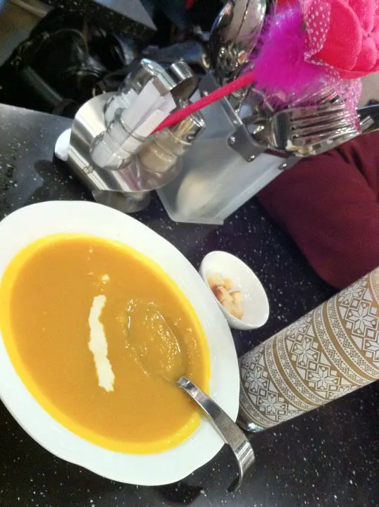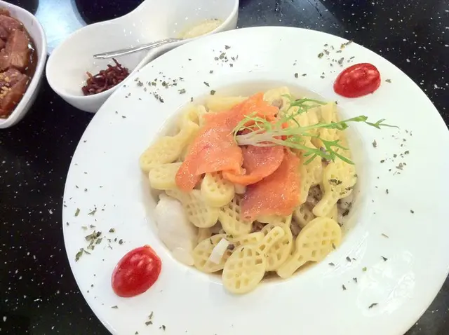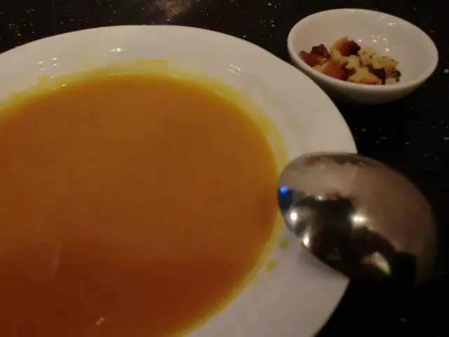 友人點了香草汁,雞絲磨菇配蝴蝶粉,我點了個水欖蕃茄醬(辣),巴馬火腿,煙三文魚"蕃茄"磨菇配墨魚汁寬條麵.名字長得可怕!!=.=!!.....,再點一個黑椒豬手粒齊齊享用.餐湯可以選擇南瓜及雜菜湯,友人不好蕃茄味,來個南瓜湯好了.偷呷了一口,南瓜味不重.連點綴用的忌廉都沒有,雖有顆粒加強質感,但極富罐頭湯風格.我就要了什菜湯,菜料足,味道較南瓜湯實在,始終自制紅湯要後加菜料,無論如何都較為新鮮吧!