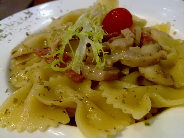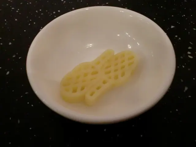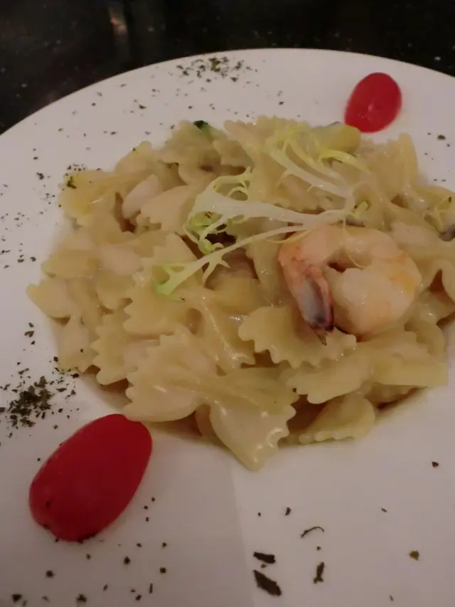 友人的蝴蝶粉賣相不差,雞絲粗粒的上,叫雞丁還更貼切.香草汁味道平平,淡淡的僅為蝴蝶粉添上濕潤,對食味幫助不多,而且那中間下陷成了碗型的碟因為熱力不斷制做出水氣,慢慢地浸軟了下層的粉.加上那種大隻厚身的蝴蝶粉難以煮得軟,變成了上半碟過硬,下半碟過軟的效果.我那碟寬麵更為明顯.相信要思考一下盛器的問題了...