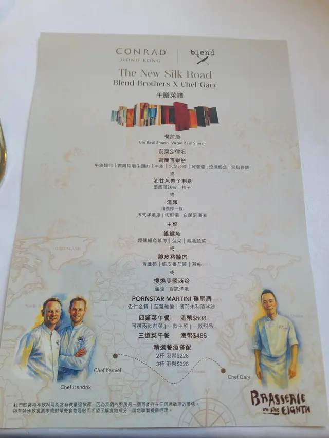 I was looking for somewhere to have a celebratory lunch and happened to see this lunch sets on a few selected days in November with guest chefs of Blend Brothers from Zeeland, The Netherlands. Price was HK$508 (4-course: 2 appetisers + 1 main + 1 dessert) and HK$488 (3-course: 1 appetiser + 1 main + 1 dessert).WELCOME APÉRITIF餐前酒Gin Basil Smash | Virgin Basil SmashWe went for the mocktail instead of the cocktail. It smelt very rich of mint and basil. Flavour was of the right degree of sweetness. There were some crispy Barley added on top. Yummy.There were three types of round bread, raisin, sour dough and baguette. They were served by a server at our table. They were still warm. The raisin bread was soft and rich in raisins. The sour dough had a very crispy surface. The other one was something not worth trying. Simply too hard.SALAD AND APPETIZER BAR前菜沙律吧There were a lot of choices at the salad and appetizer bar. Hot dishes included mussels and bacon quiche. Cold seafood included scallops, seared tuna, prawn, crab meat salad. Cold meat included beef, sausages. Cold cuts included smoked salmon, three types of ham with super sweet and juicy Italian melon. There were quite a number of different bowls of mixed salads, and also single types of veggies (asparagus, pumpkin, mushrooms, etc.). There was a type of soup which was tomato soup. I must have also missed some dishes here because there were too many to describe. Quality was reasonable and choices were plentiful. It was quite a great value for money salad and appetizer bar.This salad and appetiser bar is counted as one appetiser. It wasn't clear on the menu until the server told us so.ORDUTCH CROQUETTEbrioche | Holstein neck | Rubia Gallega fat | mizuna salad | shallot compote | smoked eel | Périgord black truffle牛油麵包|霍爾斯坦牛頸肉|牛脂|水菜沙律|乾蔥醬 | 煙燻鰻魚 | 黑松露醬A small piece of toast was topped by a piece of super crispy croquette with super smooth lava fat flowing out. It was topped by some mizuna salad and a server shaved some fresh black truffle slices on top. Texture wise it was perfect. Flavour wise the shallot compote was a bit strong. ORHAMACHI AND SCALLOP CRUDOJalapeños | yuzu油甘魚帶子刺身墨西哥辣椒|柚子Hamachi and scallop sashimi slices were placed nicely alternatively with yuzu and spicy Jalapeños in between. Some flower petals were added on top. The sashimi were very smooth. Flavour was light and appetising. This dish looked very nice.ORSOUPSPlease choose one from our selectionFrench Onion Soup | Bouillabaisse | Cream of Mushroom法式洋蔥湯 | 海鮮湯 | 白菌忌廉湯MAINSBLACK CODsmoked eel mousseline | spinach | sea vegetables銀鱈魚煙燻鰻魚慕絲|菠菜|海藻蔬菜ORBELCRISP BBQgreen asparagus | crispy ketchup | mousseline脆皮豬腩肉青蘆筍|脆皮番茄醬|慕絲A big piece of pork belly was served with crispy skin. It was quite salty and the saltiness was balanced slightly by the crispy ketchup sauce, but it was still salty. It was accompanied by four fresh asparagus. Overall I found this dish too salty. ORROASTED U.S. BEEF SIRLOINasparagus | crispy onion慢燒美國西冷蘆筍 | 香脆洋蔥Portion was big. We asked for medium rare but it was slightly overcooked. Although there was no sauce just some spices, it was not too dry. It was tender and juicy. It was accompanied by a fresh asparagus and sweet carrot mash. PORNSTAR MARTINI 雞尾酒almond crumble | pineapple tartare | mint julep granite杏仁金寶|菠蘿他他|薄荷朱利酒冰沙There was only one dessert. Dessert was served like a cocktail glass. From top to bottom, it was mint julep granite, followed by pineapple tartare in the middle and bottomed by almond crumble. It smelt very good of pineapple! Texture-wise it was perfect because there were different layers and we could even eat some super crispy chocolate thin slices in between. The sweet & sour flavour balanced nicely with the chocolate crisps, and the flavour overall was very refreshing! Overall, it was a very outstanding dessert!Iced chocolates We both ordered iced chocolates with skimmed milk. It was not too sweet.Petite fours were four Dutch shoes made of white chocolate coats with honey and tea jelly fillings respectively. It looked super nice with green grass crumbles. Flavour wise only soso. But crumble base tasted better haha.In general, food was nice and we were both very full afterwards. Environment was very decent with high ceilings, bright and large windows overlooking tall buildings. There were lots of flowers inside. Tables were not so close to each other. We were seated at a corner and it was super private and quiet. Service was quite good. We had a great time here.…查看更多