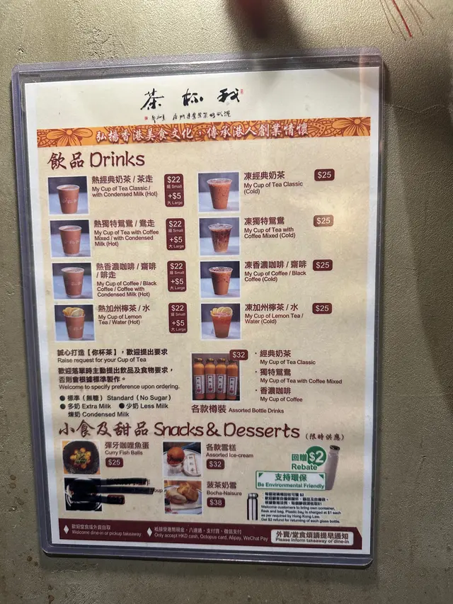 今天到了灣仔春園街,試試「我杯茶」的熱奶茶。店舖不大,堂食位置不多,一來到鋪頭,已經見到一條人龍,很多遊客在等候到店內堂食。如果外賣的話,店員會指引你,直接到店內收銀處點餐,不用排隊。單點了一杯經典熱奶茶☕️($22),不少遊客也點凍奶茶🥤和菠蘿包。除了奶茶,也有咖啡、茶走、啡走、鴛鴦、檸檬茶🍋☕️,size 有細和大選擇。熱奶茶真的很出色!茶香味濃,茶味突出,但不苦澀,茶有回甘~ 奶茶入口香滑順口,令人不自覺地想飲多一啖,飲完口腔仍留有茶香味,很讚!發揮到香港地道奶茶的味道。店內也有很多出名的食品,今天未有機會嘗試,下次再來要再試其他食品。查看更多
