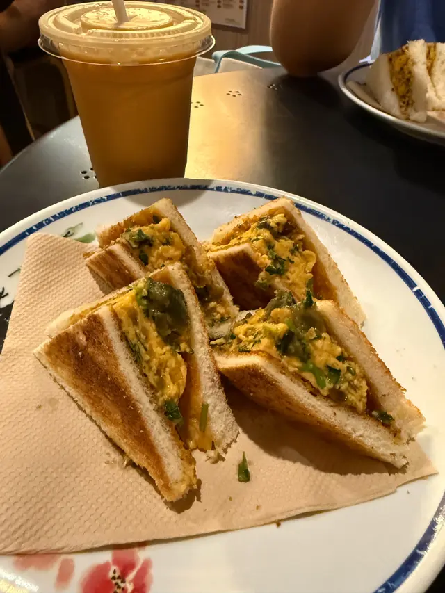 沙爹牛肉蛋菠蘿油真係每枱都見到有人叫,厚蛋夾埋沙茶醬再夾喺菠蘿包入面,口感非常豐富~👍​🌮香菜皮蛋咸蛋炒蛋三明治就好有新意,可能因為放耐咗凍咗,食落去層次感唔算好明顯😕 香菜味有D太搶蓋住其他材料味道,我個人就唔太 like 啦~​凍奶茶真係要大讚!作為乳糖不耐人士都忍唔住試一試~入口超絲滑茶味好濃郁🤩 沙爹牛肉蛋菠蘿油同凍奶茶超推薦😋查看更多