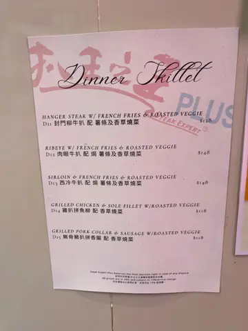 晚饭,以食物质素嚟评价的话略贵,但如果想坐得舒舒服服食餐晚饭嚟评价,咁就ok。叫咗两份嘢食,封门柳配薯条(铁板)及焗猪扒饭,唔知系咪我唔好彩,铁板淋汁但唔咋咋声,焗猪饭上既焗芝士不但拉唔到丝,仲要系已变芝士皮,烟韧到要用刀切;扒呢…,如蒙眼食,只系知食紧肉而唔知系乜肉,好彩个汁既味调教得唔差,配牛既黑椒汁够香,焗猪既茄汁唔抢喉,两汁都唔太咸。所有扒基本上都一定过百,如喺主餐牌就过二百,加50蚊有餐汤同嘢饮,但无写喺餐牌,只系点餐后店员讲,以呢个价食呢款质素既扒,出面可以有好多选择,应该唔会有机会再去!