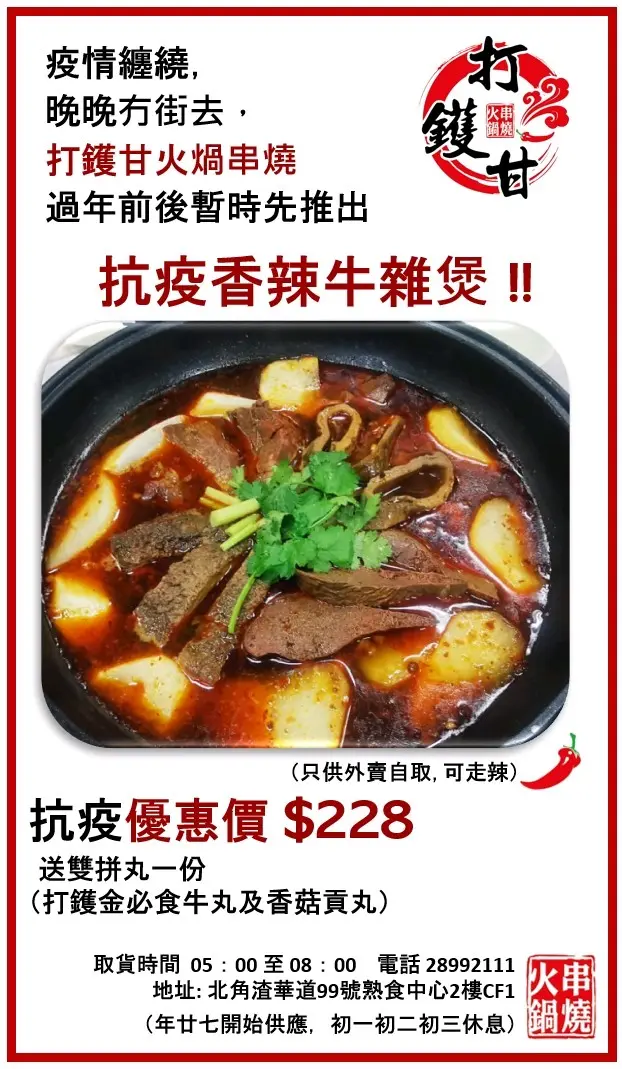 打鑊甘火鍋串燒 (北角) 网址: https://s.openrice.com/QrLS0UpuA00 地址: 香港北角渣華道99號渣華道市政大廈2樓CF1號舖 电话: +852 28992111