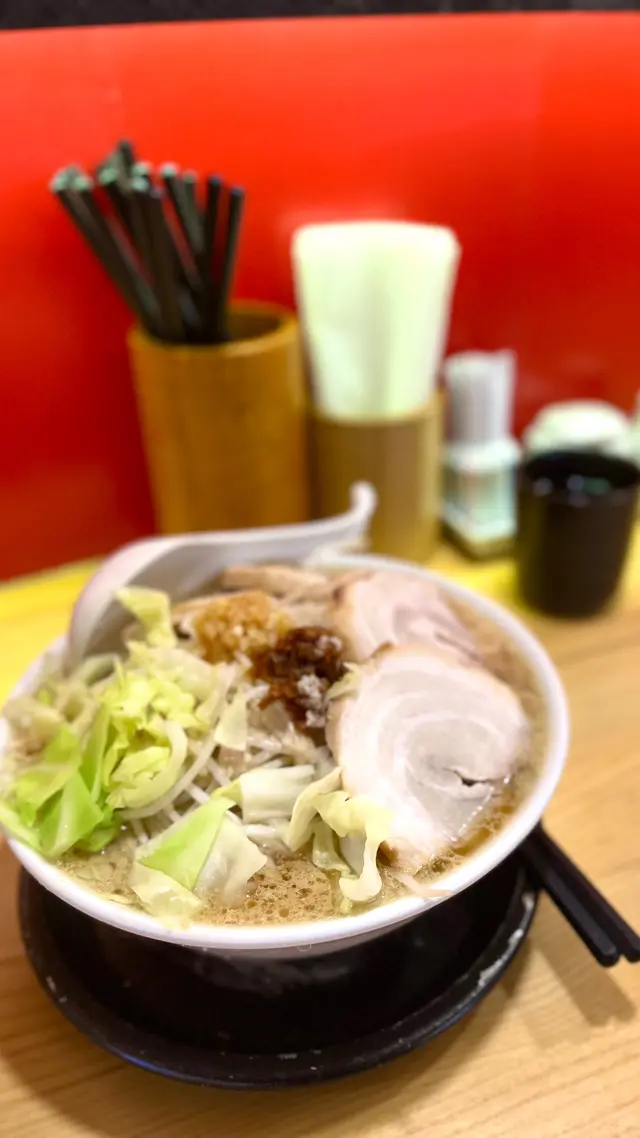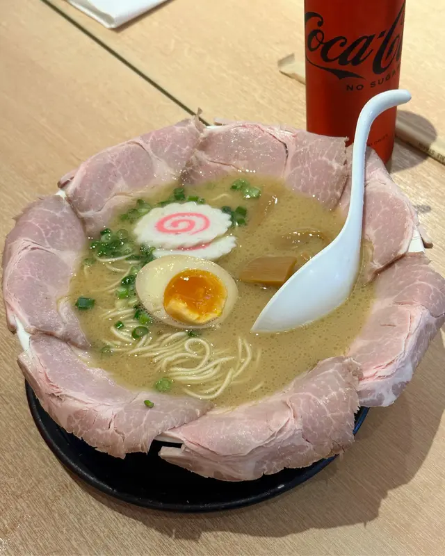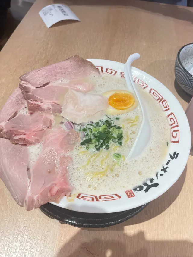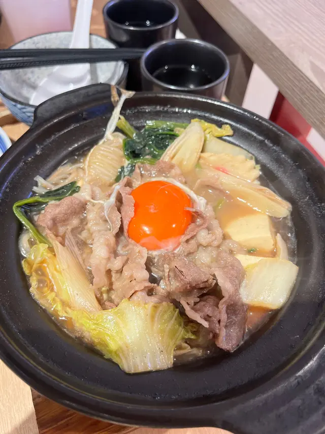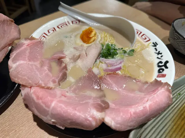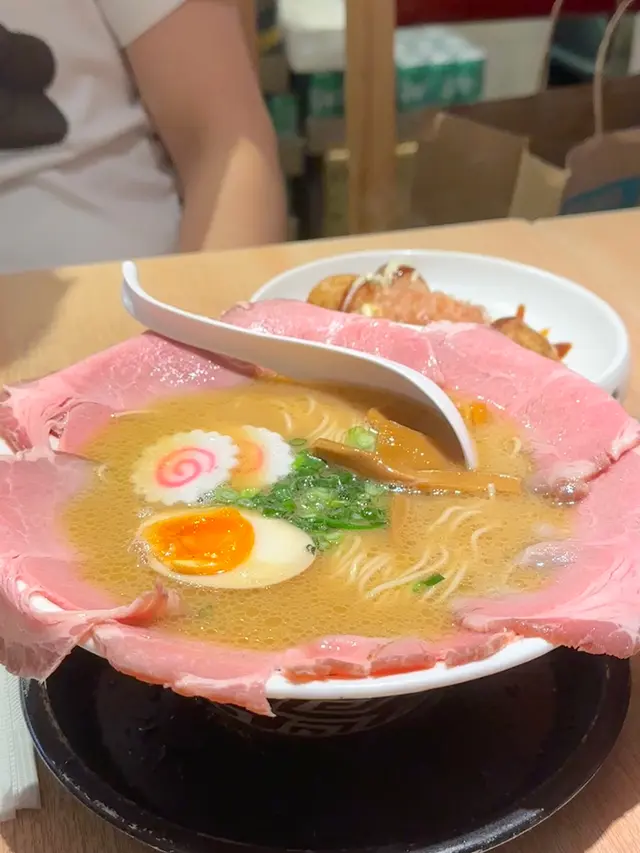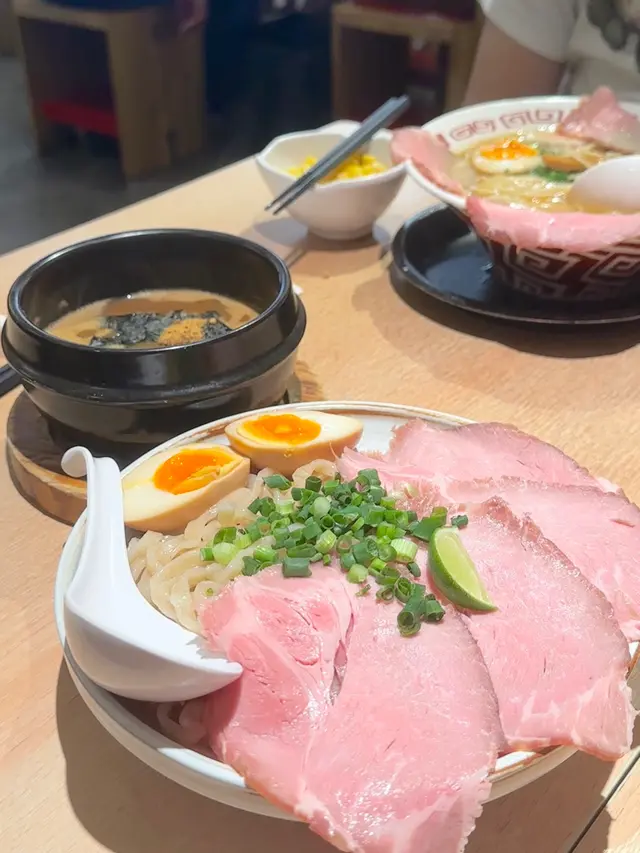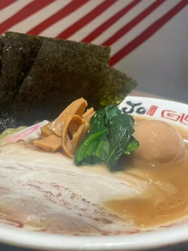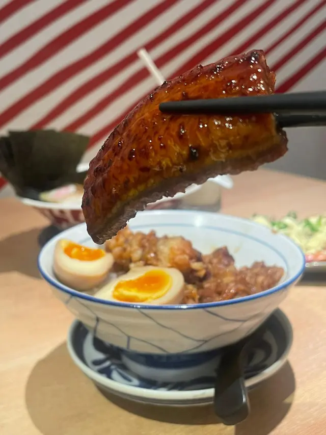 還要帶點重口味!有兩塊薄切而肉質柔軟的豚肉、一隻流心蛋、翠綠軟腍的菠菜、入口出奇地有辣味的筍絲,