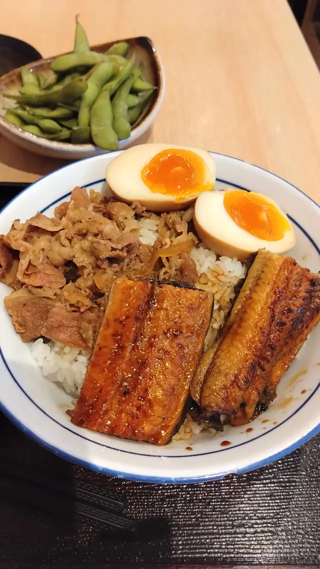 自此之後,多數也點丼飯食!既然,丼飯的配料有魚有肉,卻缺少了蔬菜,所以,我還點了枝豆!鰻魚天婦羅蝦牛肉丼 $89 (連麵豉湯)竟然最先送上桌,丼的飯碗比拉麵碗細,如果以一人份量的丼,我覺得已經足夠嘞!:)鰻魚甜美而肥瘦均勻,天婦羅蝦並非熱辣辣,勝在仍保持香脆口感,牛肉相對有點韌勁,