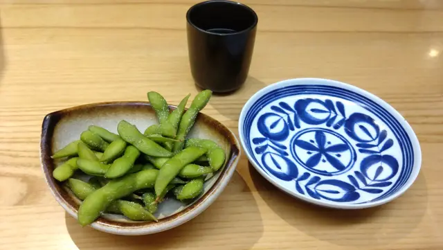 麵豉湯加入新鮮豆腐粒、海帶及蔥粒,總算不會重口味!:)枝豆 $28送上桌熱到出煙!