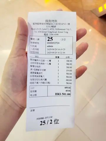 探鱼烤鱼今次要介绍一间喺观塘apm商场有一间川菜餐厅叫「探鱼烤鱼」,上年已经系沙田食过,呢间最吸引之处就系任食冰粉,上年系$1一位任食冰粉,今年已经去到$9一位,夏日炎炎$9真系唔算咩野,有冰粉任食解暑,今次仲坐喺冰粉自助吧前面,我哋两个人搞到差唔多食咗5碗,哈哈!1.香辣味烤鱼一人餐$98(10/10)最近多咗一人餐,咁样可以试下唔同味道嘅烤鱼,每一个烤鱼一人餐都会跟一碗白饭,而呢个香辣味都算大辣,入面有有豆皮、娃娃菜、一条无骨嘅鱼等等,份量绝对够一个人食,正!2.酱香味烤鱼一人餐$98(10/10)最近多咗一人餐,咁样可以试下唔同味道嘅烤鱼,每一个烤鱼一人餐都会跟一碗白饭,而呢个酱香味有微少嘅甜,入面有有豆皮、娃娃菜、一条无骨嘅鱼等等,份量绝对够一个人食,正!3.棒棒麻辣口水鸡$58(9.5/10)呢碟麻辣口水鸡唔算好辣,大约有10旧鸡件,做一旧鸡肉肉质都好嫩滑,唔错!4.易燃易爆小食天团$68(9/10)呢一盘小食份量都好多,入面有炸椰菜花、炸紫苏叶、炸蟹柳、炸酥肉、炸莲藕片等等,啱哂多人一齐分享!5.嚣张巨峰葡萄桶$88(10/10)呢桶巨峰葡萄改个名真系无错,叫做「嚣张」,「嚣张」到几乎每一台都会叫,我估容量大约3L,「嚣张」入面有提子同青柠,当然唔少得巨峰葡萄果汁,上面仲插满了薄荷叶,解辣一流!6.冻低糖黑豆浆$19(10/10)呢枝黑豆浆黑豆味香浓,仲要系低糖!7.无限探索(1份)每份$9(10/10)出面有任食冰粉自助吧,有蜜桃冰粉、冰沙、寒天晶球、桃胶、红糖汁、白珍珠、桂花蜜、葡萄干、山楂片等等...夏天入嚟真系透心凉,我叫咗两份,两个人差唔多食咗5碗!**出面仲有热茶任饮,茶有两款,菊花茶同荷叶茶**2人总共价钱$492,其他有加一服务费!个人口味总评分:9.79/10 地址:观塘观塘道418号创纪之城五期(apm)3楼L3-13号舖…查看更多