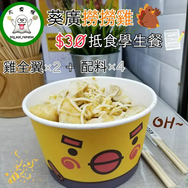 其實撈撈雞都開咗一段時間🤔不過小編真係未試過,見到佢個學生餐幾抵,梗係即刻買嚟trytry佢啦😆同男小編一人拎住一杯嘢飲差啲冇手食,好彩收銀張枱有小小位for食客企住食😚老闆好好人仲好善談添😍學生餐 雞全翼×2 配菜×4 ($30)😋好味指數:(7.5/10)今次揀咗冷麵、花枝丸、魚腐同杏鮑菇😚貪佢夠飽肚呀嘛😆醬汁有3款😚▫️秘製泰辣汁 +$5▫️秘製鹽水汁▫️和風沙律汁愛辣嘅我地當然揀咗泰辣汁🌶食落去好惹味,酸酸辣辣咁😋叫咗小辣都覺得辣辣地,唔係好食得辣嘅朋友仔真係要小心啲🤔成個餐嘅份量都幾多😚由於雞肉係雞全翼,所以份量都好多,好似食極都食唔哂啲雞咁😆另外啲雞已經去咗骨,岩晒我地呢啲懶人🤣雞肉好嫩滑唔會韌,同埋食落都幾juicy😍花枝丸彈牙同杏鮑菇都好有咬口😜魚腐夠晒索汁😚冷麵既份量都十分之多,如果配料有冷麵一個人食嘅話一定夠飽😆.⭐溫馨小提示📌學生餐星期一至五供應(公眾假期除外)📌身穿校服或出示學生證…查看更多