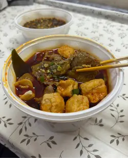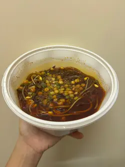 杂酱酸辣粉(22hkd) 真系抵食!份量大,粉身弹牙,杂酱香浓够辣,相当多肉碎,重酸人士绝对大爱,性价比超高,会时常回购!而且份量真系好多,一个人食做lunch都好够冒菜(68hkd) 选了麻辣汤底和主食宽粉,宽粉Q糯有弹性,素菜标配是金针菇、油麦菜、海带、豆卜、青荀片和莲藕片,全部都系吸汤神器,啖啖爆汁红油好邪恶,莲藕同笋片超级爽脆,肉类可以9选2,我选了猪颈肉嫩牛肉,材料俾得好大方,猪颈肉爽口,嫩牛肉厚切!