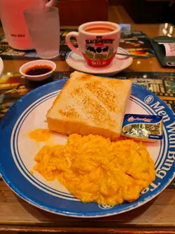 常餐$59 ~ 惹味五香肉丁 通心粉, 軟多士,煎雙腸&太陽蛋, 凍檸樂$6, 熱齋啡$20