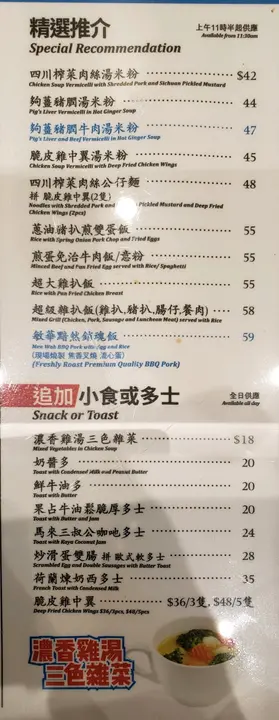 下午茶想食一个平平地嘅汤面。行过见到蓝底白字logo嘅敏华有啲怀旧电影poster,见到餐牌一个汤面配多士炒蛋先50蚊就狗冲左入去,点知系自己发鸡盲,原来系要加12蚊先有多士炒蛋