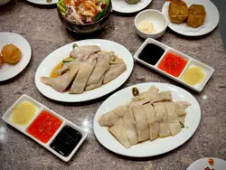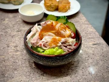 今次系铜锣湾登龙街发现了一间来自星加坡的过江龙老店,这店是在当地夺得米芝莲的殊荣,喜欢食海南鸡的我绝对不容错过的。🐥🏆😋👍🏻一人鸡饭套餐($88),套餐包括了一份镇店的招牌白切鸡、油饭、酸萝卜和节瓜汤。这店白切鸡的色泽偏白,以泡浸的方式煮,肉质较为滑溜,鸡皮非常薄身,中间夹住了一层薄薄的水晶皮脂,Q弹嫩滑,伴鸡的三款秘酱汁(酱油、辣椒酱和姜蓉)都很入味足料。我很喜欢将姜蓉放在粒粒干身分明的油饭一齐食,感觉美味甘香。🐥🌶️🧄🍚点这份一人套餐可以用平价自由追加配搭小食,弹性最高,而且仲可以品尝多款美食,所以性价比都几高。😄👍🏻黍式海蜇鸡丝沙律(+$28),凉拌海蜇爽脆,加入了沙律菜、车厘茄、青瓜和鸡丝,再捞上辣酱,酸甜惹味醒神。🥗🌶️五香虾枣(+$18),虾滑混合了猪肉和马蹄,外酥内嫩,咸咸香香,口感丰富。🦐🐖脆炸虾丸(+$18),金黄外脆的虾丸,虾胶弹牙,搭配甜酸酱更美味。🦐🫔脆炸手工韭菜饺(+$18),外皮薄薄炸得金黄起泡,内里的馅韭菜新鲜,香而不腻。🥟🌿京都排骨王(+$38),排骨厚肉嫩滑,甜酸酱汁挂汁入味。🥩🐖套餐加$15就可选多款自家制的樽装饮品,我就选了香印冷泡茶和红枣桂圆茶,滋润又有特色。☕️🍹…查看更多
