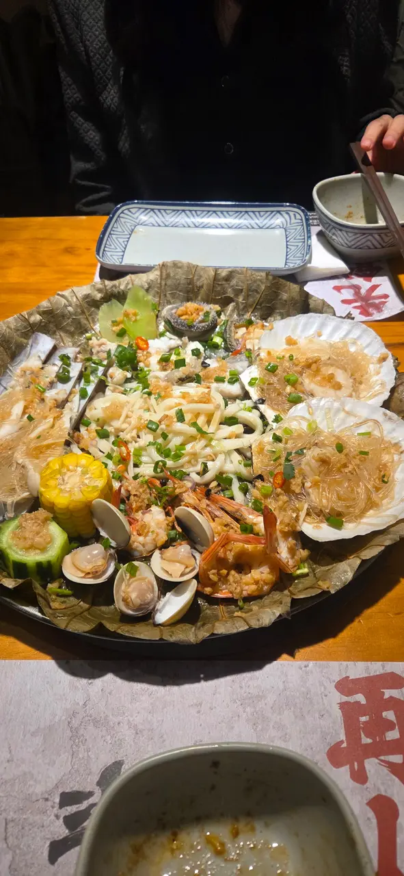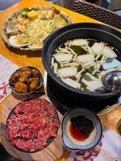 有沒有想過雞煲、海鮮、火鍋,可以一次過用一個價錢出現在一餐晚餐裏呢?可以滿足到3個願望的,就是斗滾啦~首先會吃雞煲,有五種辣度,我們點了BB辣,不過覺得辣度可以接受,下次可以挑戰小辣,吃起來更加香辣惹味。我們自行在外面拿了豬皮、魷魚、牛柏葉,自製多種配料的雞煲,吃起來更加豐富啊!吃完雞煲之後,就是吃海鮮拼盤,是我最期待的唷!蒸好的海鮮,不用等立刻可以夾來吃~拼盤有鮑魚、蝦、龍躉、蟶子、粉絲扇貝、蛽、烏冬、節瓜、粟米,全部都用蒜蓉來調味,不需額外加什麼調味料,單吃已經鮮甜又惹味!然後就是火鍋了!火鍋湯底我們選了+$38淮山鷓鴣燉湯,這個湯可以健脾潤肺,湯料的鷓鴣不是只有骨架,還有不少肉吃的。另外有瘦肉、雞腳、杞子等,非常足料!火鍋之前我們都不浪費,各喝了一碗湯,味道很濃郁。火鍋配料有任點牛頸脊和豚肉片,肉味香濃,脂肪和肉的比例均勻,兩樣都十分高質素啊!絕對是必點~而外面自取的推介八爪魚和鯇魚片,肉質新鮮。最後是甜品時間,有椰汁雪燕可以自取,椰汁味濃郁配上一絲絲的雪燕,好味又養顏!還有切好的水果,一碗有齊火龍果、西瓜、哈密瓜、橘,每樣都可以淺嘗一下呢~水果全部都很鮮甜,飯後吃點幫助消化,消除一下油膩感。💰298一位✔️餐廳設加一服務費
