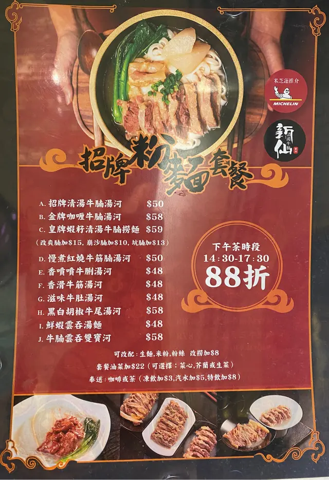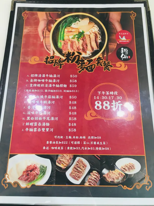 和以前的新仙最大分別的是, 她店舖的裝橫變得更整齊而光鮮, 以牛腩麵食小店來說已經夠高級, 應該是為了再見吸引米芝連一眾評審的胃口. 來到這裏一定要點她不同部份的牛腩, 接近華南的價錢 , 但依然比九記的便宜. 爽腩河的爽腩夠肥夠滑, 上下兩層皮清晰可見, 湯頭在外表和味道上也夠清. 可惜的是河粉煮得很糊爛, 完全夾不起來, 很不滿意. 至於脆皮牛坑腩反而令人驚喜, 脆皮平均分布而且厚薄適中, 配上花椒的麻辣也夠美味, 最重要是牛腩依然保持腍身而Juicy, 果然不負其牛腩專家之名. 只是河粉真的差得令人跌掉眼鏡呢!查看更多
