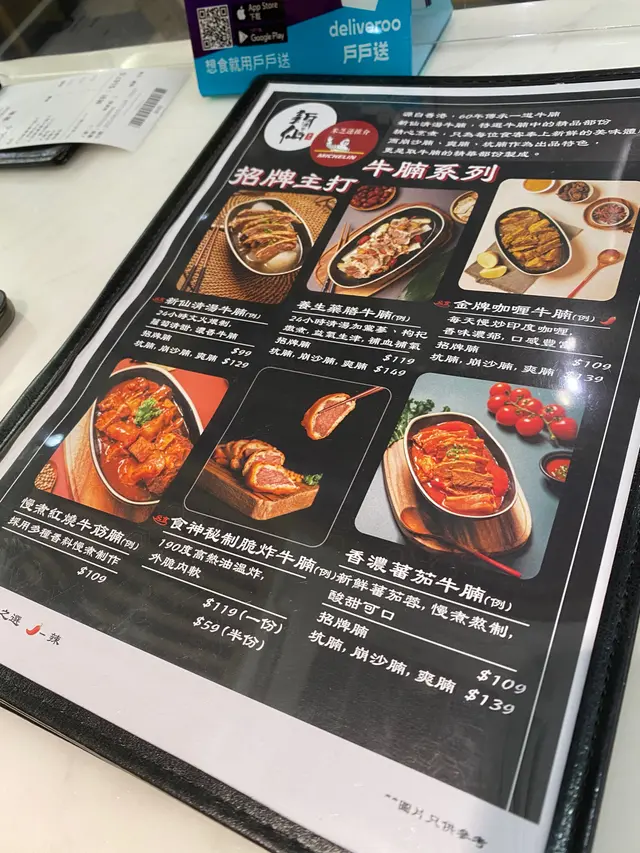 今日4月10日,行過見到呢間新仙裝修幾好,重寫住米芝蓮進介,好似好得好惦,一開始只是想叫牛腩河,想想下,可能佢d牛腩好得,就叫左一個單人套餐,價錢119,絕對不平,有三個小食,一個湯,二份牛腩,可以選味道,我選了麻辣燙同清湯,上菜速度快,賣相ok,小食唔講,都咁上下,青瓜果d。入正題,個湯坦白講ok劣評的地方開始1.二份牛腩加上黎得十件,呢個價錢,認真少囉,一碗粉都6件左右,賣40元碗😅重話無限添飯,咪玩啦,食一碗飯都唔夠牛腩2.牛腩好難食,太瘦了,又無味,d肉勁老😔3.蘿蔔一定末夠時間,唔淋,又系無味4.麻辣味牛腩,完全唔麻辣,系清湯加幾點辣油就,,,,,,可以再求其啲😡查看更多