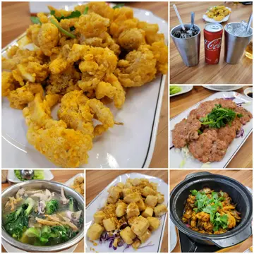 他们的菜色超多,小菜、粉面、烧味、铁板…甚至是点心都有🤩🤩真的看到我们的选择困难症都要发作了🤣🤣🤣最后我点了7个𩠌,有黄金虾、菠萝生炒骨、椒盐豆腐、酥炸猪大肠、红烧乳鸽、蔬菜粉丝煲、沙嗲牛肉煲🍽️黄金虾外层金黄酥脆,虾肉鲜嫩多汁,超好吃,让我一口接一口,停不下来。🍽️菠萝生炒骨,酸甜的滋味层次分明,肉质鲜嫩,让我忍不住再多夹一块。🍍🍽️椒盐豆腐外脆内滑,带著微微的香气,伴饭一流🍽️酥炸猪大肠外皮香脆,内里柔嫩,再点上酱汁,好好吃呀🍽️红烧乳鸽真的做到皮脆肉嫩,香味扑面。契女小小人仔都忍不吃完再吃🍽️蔬菜粉丝煲不能说是煲,是一盆上来,份量超大!!蔬菜鲜味再配上吸满了汤汁的粉丝,让每一口非常好吃🍽️沙嗲牛肉煲牛肉的鲜嫩与沙嗲酱的香浓相互交融,又是一道伴饭的好菜色他们的小菜价格实惠又不贵,份量超足。我们6个大人加两个小朋友个个都吃到捧住个大肚子离开