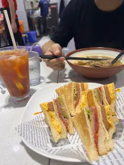 (收据喺最后)屋企行去唔驶10分钟先生当然成日去,今日下午我食左,先生食车仔面牛腩加水饺生面~公司三文治馅料丰富芝士蛋五午餐肉夹住下层生菜蕃茄酸瓜清爽之余完全无油腻感,轻轻松松4件食哂~车仔面牛腩无摄牙一丝丝亦唔柴,浓浓牛腩汁同牛味浓郁水饺里面有虾,云耳之后当然点小得有笋丝。鲜虾弹牙云耳同笋丝有口感。~冻央少甜央味奶茶同啡配合得啱啱好,从无失望~冻柠茶走甜茶胆够哂浓完成系茶餐厅柠茶仲有4块柠檬,相当阔佬