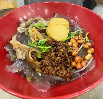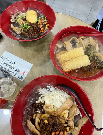 路过门口看到餐牌已经好吸引,店家主打各式粉面,有汤粉和捞粉夜晚人不算多,要和别人搭台。捞宽粉看起来很有特色,再加海带和牛百叶,充足的一餐~上菜速度很快,看起来量不算大,配料很足,炸花生和肉酱超级美味~算是很有特色的自家制调味。将所有食材搅拌好,别有风味。海带和牛百叶各有特色,很有嚼劲。宽薯粉煮至软硬刚好,一点也不会腻。浓郁的酱汁也很入味,一碗下去刚刚好吃饱。芽菜、葱、香菜等佐料也能调整口感。很好吃,还会再去!