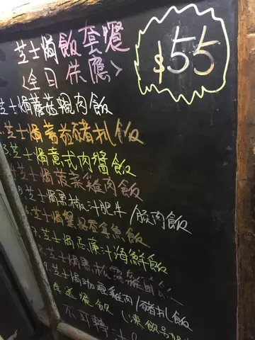 叫食芝士蕃茄焗猪扒饭 (HKD 55)。饭不是炒底,失色,失香,失味。焗饭不用炒底是最为错误的情况,就似铁板用碟上,算唛野?饭底稍硬,不是焗饭应有的硬度,相信来货米或未有浸泡的原因。猪扒有其他味道,并不单纯。应已事先腌制或煮熟,并不合适用作焗饭。猪扒肉质梅烂,并没咬口,厚度稍比大家乐少。只有蕃茄汁很酸,但又没有蕃茄,好失望。其他配料又没有,好失望。坦白讲。永远食焗猪扒饭,一定会要大家乐比较。有基准就比较到。唯一值得的是芝士量,如墙边广告般,可拉丝。