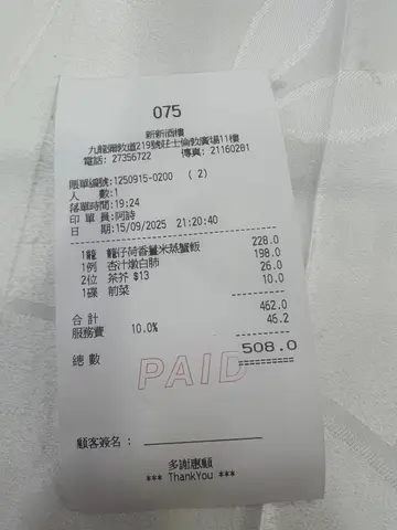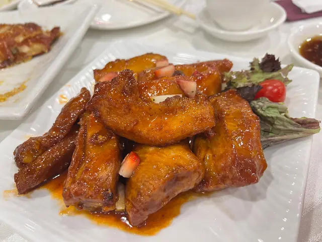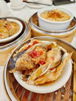 清蒸沙巴大虎斑 1 条 (大)大虎斑蒸得靓,卖相很有气势,看起来多肉,夹下夹下果然多肉,蒸得刚好,新鲜,肉腍好食!白饭 $15在询问白饭的状况时侍应回覆白饭是即叫即蒸,所以要等,等下无问题,我哋只是想食梅菜扣肉捞饭吧!富贵黄金百花球虾球炸得结实,外脆内软,加入酸辣酱更好味!红烧竹笙鸡丝翅清楚见到材料丰富,汤亦鲜美,我哋饮晒一整锅。鸿运乳猪件全体以餐饮次序来算,鸿运乳猪应是第一道菜,但食到中段才到,乳猪皮脆肉厚,好食!金钱鸡 5 件 $190一直好期待的金钱鸡来了,闻到烧味的香味,汁少少甜,金钱鸡油脂味丰富,配青瓜可以解腻。5件金钱鸡有两件较硬,花点时间才可以咀嚼好,有点失望! 蚝皇金钱扣玉掌份量几多,玉掌下面的生菜更多。玉掌味道尚可,可以再更入味,冬菇和生菜好食,又多一款好下饭的菜肴!新新一品脆皮鸡 半只脆皮鸡闻到好香,皮好薄好脆,鸡肉腍身,不用蘸酱汁都够味,个个都好喜欢
