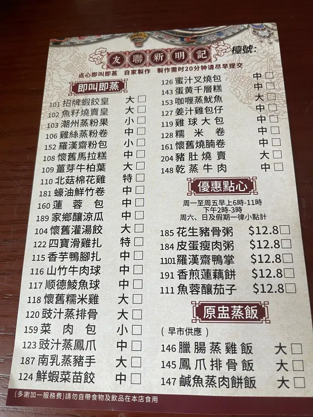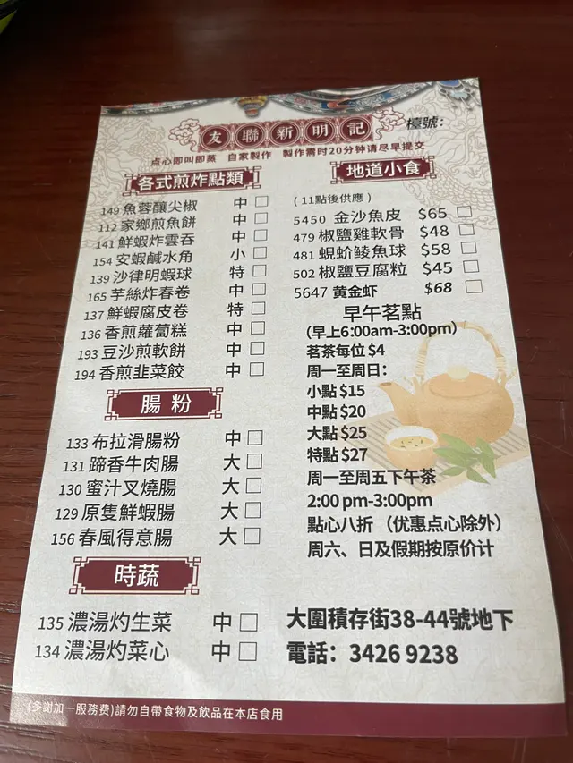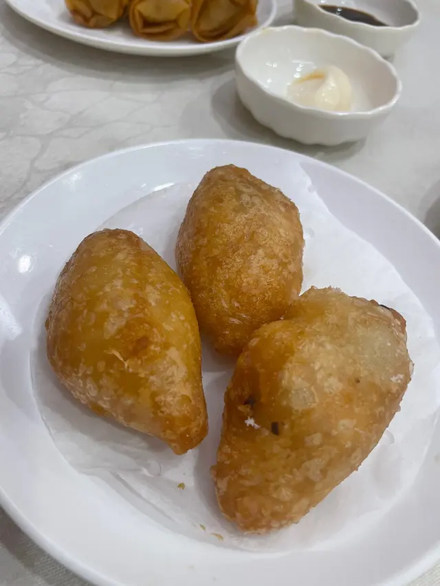 假日人多,到處都冇位,咁啱路過新明記,平時看上去是打邊爐的,亦應該因為位置的原因,不是很多人知道這裏可以飲茶,所以有位,就一嚐。春卷,裏面有些芋頭,正常level。鹹水角,皮有啲厚,咸料可以。這個點沙律醬食,味道不錯。懷舊燒腩卷,因為不是到處都有得食所以叫了,推薦一試。招牌蝦餃王,蝦幾大粒,熱辣辣。豉汁蒸鳳爪,同樣是熱辣辣,大大隻。香芋鴨腳扎,裏面有鴨腳、豬肉、芋頭,味道正常。亦拍下了部分的餐牌參考。查看更多