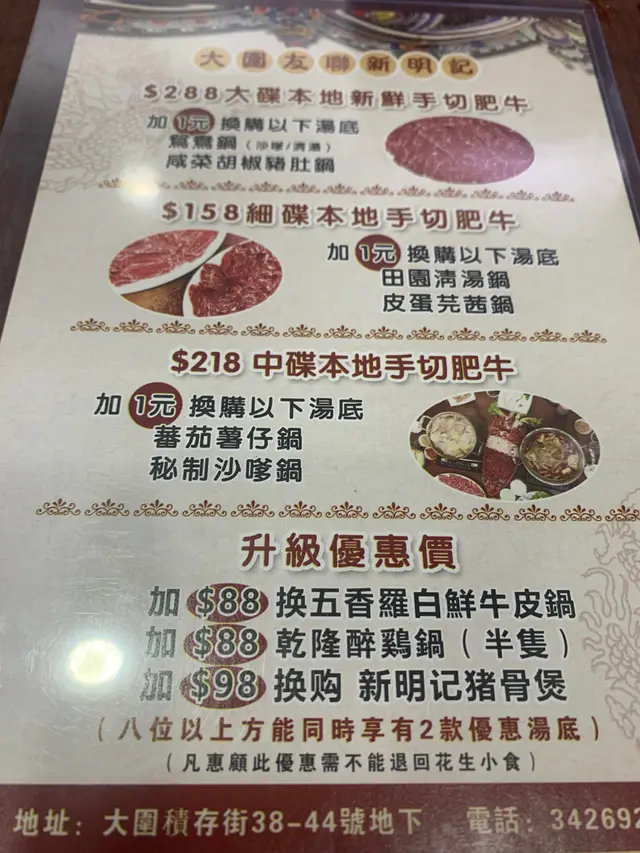 今次去到大圍美林村打波其實一路期待緊係打波後的活動就係去 《新明記》打邊爐呢個先係全日的重點門口有得泊下車位置係大圍油站附近非常方便!其實新明記晚市都幾多人同朋友先行去搵位啦搵完位其他人好耐都未到太肚餓忍唔住叫咗一個 金沙魚皮金沙魚皮出色!非常突出的咸香鹹蛋黃炒到起沙 口感一流!魚皮本身好香脆0秒清碟想再叫多一碟但要留肚打大佬!極品肥牛船頂級既!一上檯被佢霸氣震懾左你見到餐廳內師傅將肥牛逐塊逐塊手切放上船牛肉本身好靚牛船食到唔同部位嘅牛有手切肥牛 / 牛黃喉 / 牛仔粒 / 牛爽肉每個部位的牛肉都有特色有軟淋的 / 有爽口的 / 有牛味重的 / 有肉味甜的基本上每次再去打邊爐極品肥牛船係我必定會叫呀強力推介!查看更多