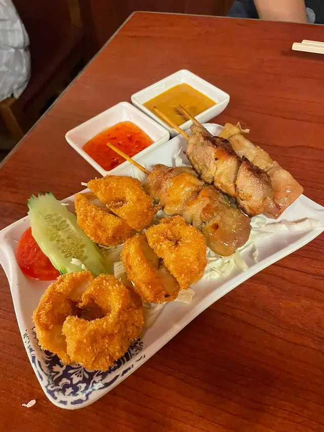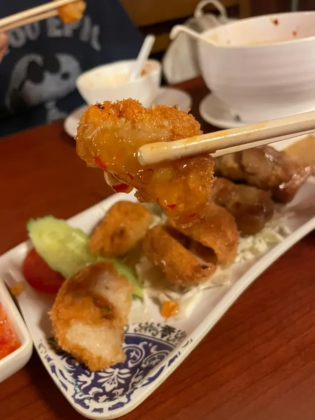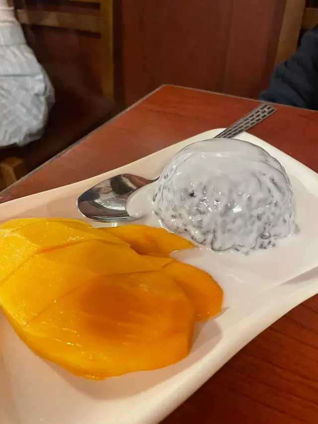 灣仔這地方高樓大廈林立,四處盡是美食。這天下班,和友人往銅鑼灣漫行,走過集成中心遠一點,隨心選擇餐廳時,被這一間「新曼谷泰國菜館」的特色佈置氛圍吸引了😍餐廳門口放著一個合掌公仔,像在歡迎客人光顧。甫步入餐廳,掛著特色壁畫、擺放著籣花,滿是異國風情 - 就知我即將開展一場不一樣的泰國飲食之旅🚗這天大約是晚上7時半🕣下層已坐滿了客人,但原來還有「樓上雅座」,可見這餐廳地方頗大,無需等位就能直接入座。泰國傳統裝潢風,牆身有點殘購,但說明這是歲月的痕跡,屹立多年的歷史。餐桌之間夠寬闊,空間感足夠,燈光稍暗,滿是氣氛!走到上層,看到右邊泰國大象🐘的刺繡布畫,做工細緻,濃厚異國風情!餐牌圖文並茂,很多食物都配有相片,方便客人精選心水菜色。當我們在選食物時,店員也十分有禮貌,奉上兩杯清水。食物包括小食、沙律、飯類、河粉、甜品及飲品。菜色五花八門,每樣都非常吸引,不知如何選擇,真是幸福的煩惱啊!所以最後選擇了泰國最經典的菜式😛服務員是泰國人,很正宗!🧆泰式小食拼盤 $98拼盤包括炸蝦餅三件及雞肉串燒三串,肉食獸大滿足。炸蝦餅熱度剛到好處,金黃脆身,超香蝦味。配上酸酸甜甜嘅甜辣醬,十分開胃惹味,吃到停不下來。雞肉串肉質緊緻,彈牙鮮嫩。加上泰式沙嗲醬,充滿層次感。🍜冬陰功湯河 $68冬陰功湯結合辛辣、酸甜和香料的味道,河粉口感柔軟順滑,完美吸收湯汁的味道。還搭配了香菇、洋蔥和蝦肉等配料,味道更豐富。蝦肉件數至少6塊,新鮮彈口,十分足料。所以喜歡辛辣的你絕不能錯過。🥭芒果黑糯米 $50芒果呈橙黃色,果肉腍滑,甜度適中,水量十分高,非常多汁。椰汁滿佈黑糯米上,呈上時有微煙,暖暖的,是最佳品嘗狀態,非常貼心。🥥椰青 $35椰青水滿滿,十分清澈。入口清新,甜甜的椰香,剛好平衡其他菜式的重口味。灣仔區的餐廳眾多,這間價位算是大眾化,而且很有泰國特色,性價比高,附近上班族可考慮👍🏻查看更多