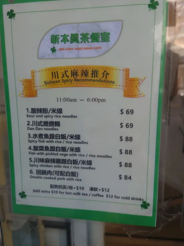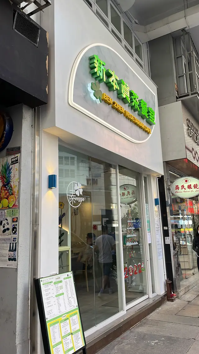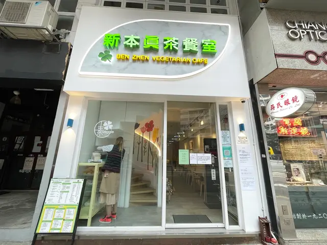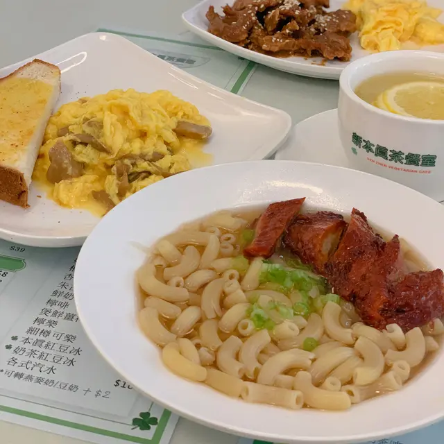 新本眞茶餐室 (English name: Ben Zhen Vegetarian Cafe) isn't your usual cha chaan teng. Like the name states, it offers vegetarian food.Menu is in English and Chinese. There is no 10% service charge. Offering a variety of cha chaa teng classics along with vegetarian Hong Kong style baked goods.I decided to give it try with a classic cha chaan teng item: the all day set ($62). This includes char siu with noodle in soup, scrambled eggs, slice of toast and a drink.For the noodles, you get a choice of macaroni, instant noodles or rice noodles. I chose macaroni. A generous enough portion was provided. The soup tasted like a vegetable broth and there was no MSG. The macaroni was not too soggy. The char siu was basically sweet and savory wheat glutten.The slice of toast was ok with a generous spread of butter. The eggs were over cooked and a bit tough. Slices of button mushrooms were mixed in.The food was ok with not MSG detected. Service is a bit slow. But  it's nice that there is a vegetarian option for those that don't eat meat.查看更多