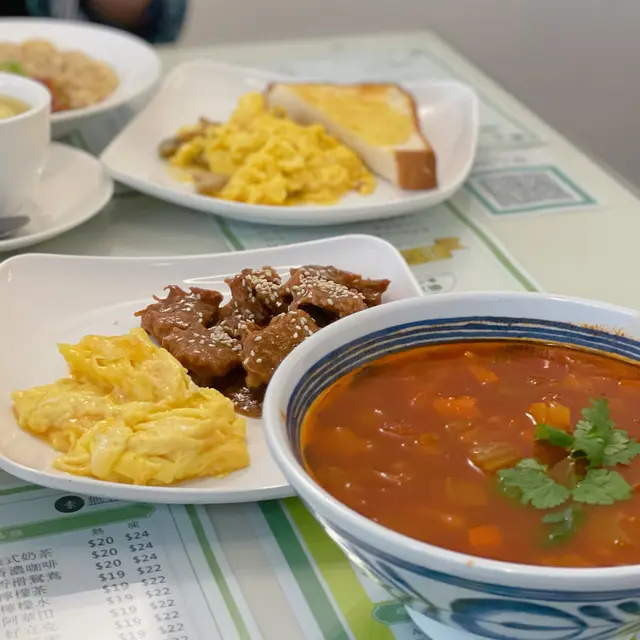 茶記好多香港人成日都食架啦但今次介紹既並唔係一間普通茶記😝係而間餐廳叫到所有野都係素😮就咁表面睇, 都完全睇唔出係素😮😮 仿真度極高!!!除此之外, 味道都好似👍🏻👍🏻👍🏻常餐-叉燒通粉拼蘑菇炒蛋餐 ($59)素叉燒既質感同真叉燒真係好似, 因為佢既調味係跟足港式燒臘做法, 超香蜜味, 正!!😋鮮茄濃湯螺絲粉拼沙爹牛炒蛋餐 ($68)茄湯好清甜, 蔬菜粒大大粒, 唔錯~最驚喜係沙嗲牛肉!!!雖然佢係用大豆纖維整既, 但味道同真既沙嗲牛勁似!!🤩🤩沙嗲醬汁都做得好似, 香味濃郁😍👍🏻個人覺得而間素食好有創意,而且同平時茶記食到既野都好相似,又平又健康又特別又岩香港人口味~ 💯!!查看更多