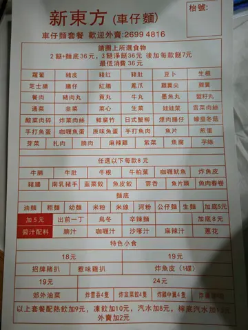 新東方車仔麵 (沙田) 网址: https://s.openrice.com/QrLS0Eqe900 地址: 香港沙田協欣街1號智和樓地下SU28號舖 电话: +852 26994816