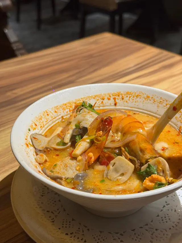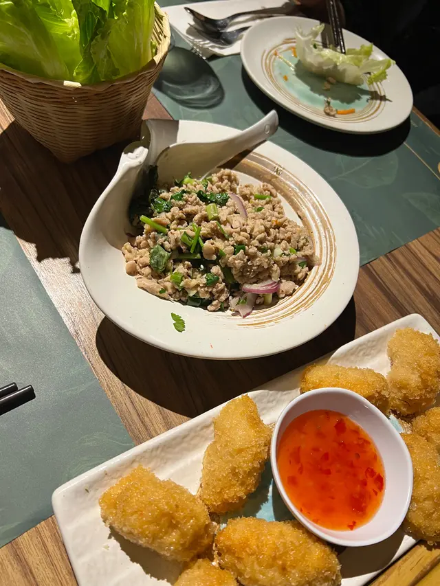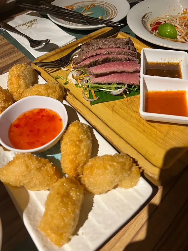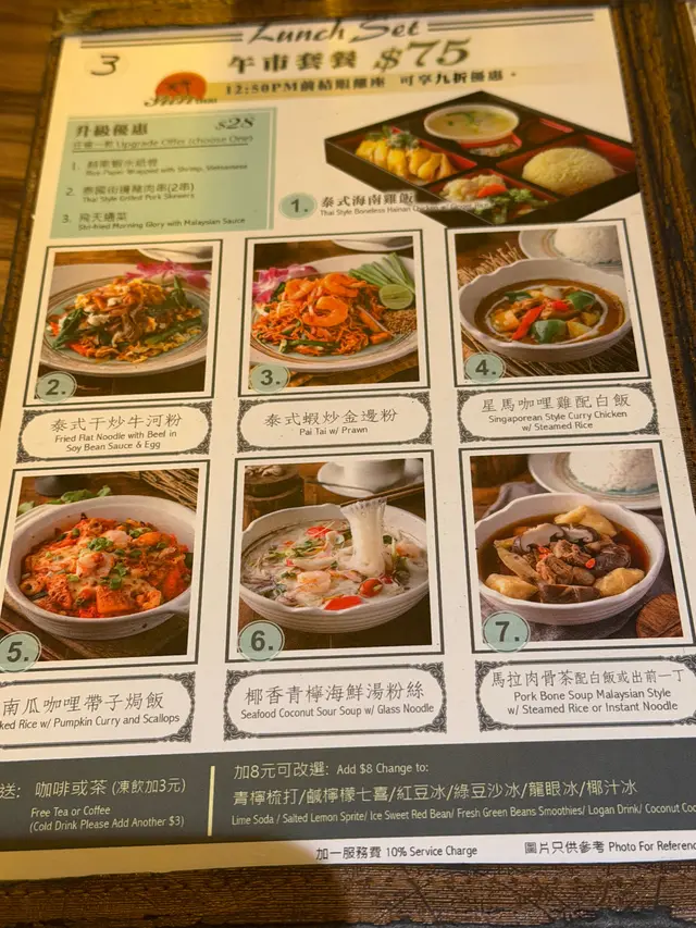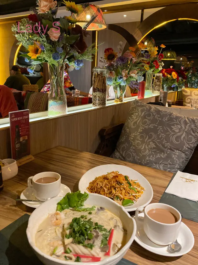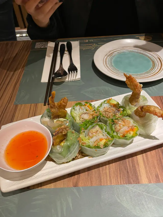 今日去咗這一間《新泰》東南亞餐廳位於尖沙咀、整間由外到內都好有泰式風格、係以淺啡色為主調木系裝置整間店鋪、以黄光色澤坐著寬敞舒適感覺都唔錯!望見餐牌都好多選擇、同時都睇到二人套餐 $228,都叫咗嚟試吓好似幾抵食、三款食物同一款主食揀,仲包兩杯嘢飲!越式蝦米紙卷呢一款蝦米紙卷五顏六色都幾好、用咗通透軟綿米紙包裹蝦及其它配料、入口軟綿帶點多重爽口、沾吓酸醋汁更加好食又醒胃!泰式青咖哩雞印度烤餅呢一款青咖哩雞望見賣相都唔錯、真的好有地道風味、佢嘅青咖哩汁香而美味、配埋雞肉及其它配料、雞肉又有咬口沾滿汁液都唔錯、尤其是佢嘅烤餅啖啖口感、點吓青咖哩汁烤餅別一般的味道!馬拉盞炒通菜呢一碟馬拉盞炒通菜好有地道風味、翠綠通菜色澤加埋佢嘅味道、感覺好似蝦醬一樣咁惹味、佢嘅味道好香濃美味一樣咁爽又好食!港式凍奶茶 +$3 凍檸檬茶 +$3泰式甜品小拼盤$98呢一款一碟有4種味道、一共有8件細細件、有椰香大菜糕、椰汁西米糕、斑斕糕及其它糕、每一款都唔錯尤其是斑斕口感煙糯、甜度適中帶點斑斕味道! …查看更多