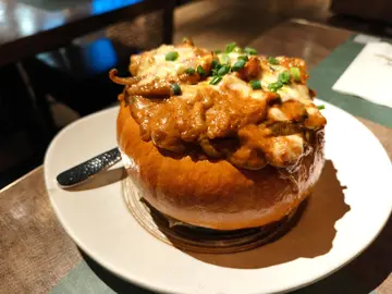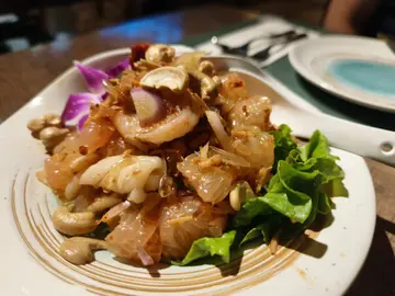 泰式柚子虾沙律有好多柚子肉,好甜,再加埋个酸辣汁好好食。里面仲有虾同鱿鱼,亦有腰果洋葱等,味道口感都非常丰富。