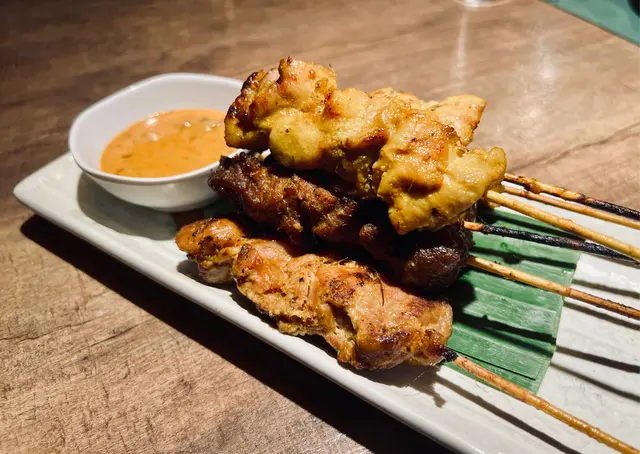 串燒沙嗲 雞牛豬總共有6串,雞牛豬每款兩串。啖啖肉,沙嗲醬好香花生味。