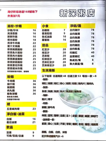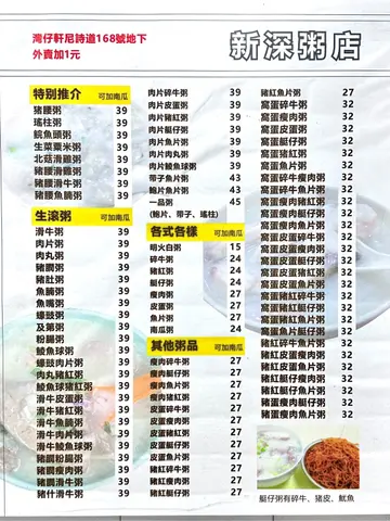 成日坐车经过湾仔都会望到呢间新深粥店,今日有机会试下佢地既出品。早餐时段到店,坐满8成食客,揾到个位坐低睇下个餐牌,佢地有好多款粥品选择,我最后点了一碗艇仔粥同一碟牛肉肠。好快两样食物一齐送上,都系热辣辣的。粥底系用一粒粒米煮成既,配料有碎牛,水鱿同埋猪皮,味道偏淡,至于牛肉肠就得个豉油味,一d牛肉味都冇。[米饭]口味:🥚🥚🥚[薄荷]环境:🥚🥚🥚[服务铃]服务:🥚🥚🥚[糖果]性价比:🥚🥚🥚…查看更多