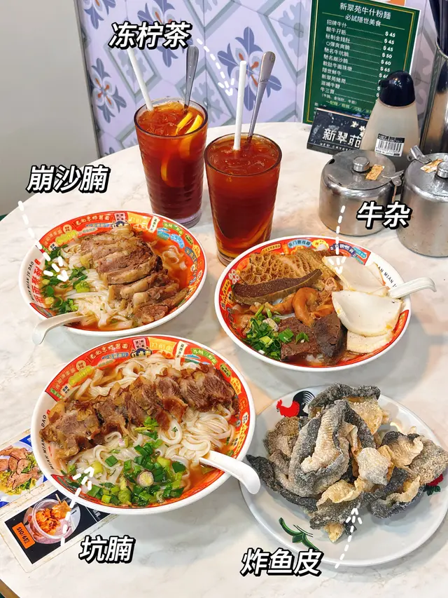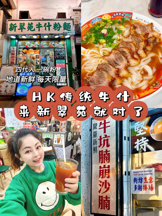 🇭🇰四代人只为一碗牛腩粉 水蜜桃晶晶等级22025-02-06234 浏览 关注 四代人只为一碗牛腩粉新年来港,不要只知道去网红店啦,今天我路过的这家新翠苑就真的很不错,店面简洁接地气,他家的牛腩炖的超级入味,很软超好吃,据说都是本地人来光顾的老牌店铺了。我们点了三份,分量很足,口味真的不错👍【坑腩河粉】坑腩是牛肋骨之間,去掉肋骨後出現一條坑,故名坑腩。坑腩表面帶有筋膜,肥瘦適中,肉質緊實,久炖之後香而不爛,口感很不錯【崩沙腩河粉】崩沙腩是牛腩中最矜貴的存在,它屬於牛腹部下面橫隔膜,有皮有筋還有肉,可以算牛腩中的極品啦,這家店的崩沙腩已經煮的非常軟糯,肉質酥而不爛,筋膜部分比較爽脆,一口下去都是牛肉香【牛雜河粉】牛雜的用料真的是很實在,濃濃的牛肉湯底,搭配上金錢肚,牛蒡,牛肺,牛腸,全部都是大大件,牛雜炖的夠軟,濃郁的香味真的回味無窮。我們還外叫了一份炸魚皮,脆脆香香,簡直是牛腩河的美味搭配。小店老闆人也很nice,據說這家店已經做了四代人了,真的是用心只為一件事呀,店鋪雖然不大,但都是本地人來光顧,牆上也貼滿了港星打卡的照片,走過路過別錯過啦。🐂店名:新翠苑牛什粉麵地址:佐敦白加士街129號地舖(近佳佳糖水,永安百货后面)…查看更多+ 8以上食记乃用户个人意见 , 并不代表OpenRice之观点。赞好分享🇭🇰四代人只为一碗牛腩粉 新翠苑牛什粉麵 https://s.openrice.com/QrLT020fQ00检举 张贴 评分4味道4环境4服务4卫生4抵食用餐日期2025-01-24用餐途径堂食人均消费$50 (晚餐)
