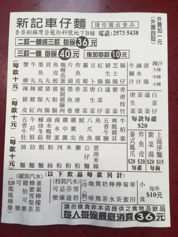 今天晚上2020年6月16日19:30左右,在铜锣湾登龙街49号B舖地下新记车仔面,我和女儿各叫了一碗车仔面,我叫3款𩠌,净𩠌,𠮶女侍应写得不大清楚,似30又似36,我问过女侍应,佢话3款𩠌30元,咁我不以为意,我大女叫了65元一碗车仔面,后来我地食完后再加2款𩠌唐生菜和鱼蛋20元,个侍应写在贵的单上,后又再加牛孖筋10元,又是写在贵的单上(65+20+10=95),埋单时本来就是30+95=125,怎知侍应生话有最低消费,30元𠮶张单最少要收36元最低消费,如果是这样的话,为何我加2次𩠌,妳不写在30元的单上,而专登写在贵的单上,夹硬局30元𠮶张单唔符合最低消费,我唔知情,俾500元找数,佢找番369元俾我,夹硬收多我6元,其实我应该付125,而不是131元,佢唔找正确的数给我,我谂过报案,但好浪费时间又劳气,唯有俾佢呃一次,以后唔再帮衬!!!…查看更多