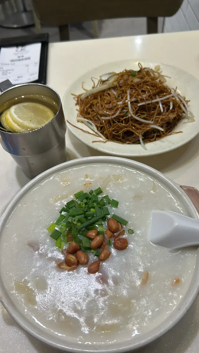//行開旺角,下午茶又想食粥入咗去呢間 元朗新記🥹叫咗個 《艇仔粥+炒麵 下午茶set 》 連熱飲☕️艇仔粥入面都多料,有肉絲,豬皮,魚片,魷魚粥底都綿,係略嫌豬皮嗰日有啲臊味😢豉油王炒麵就正正常常🥹查看更多