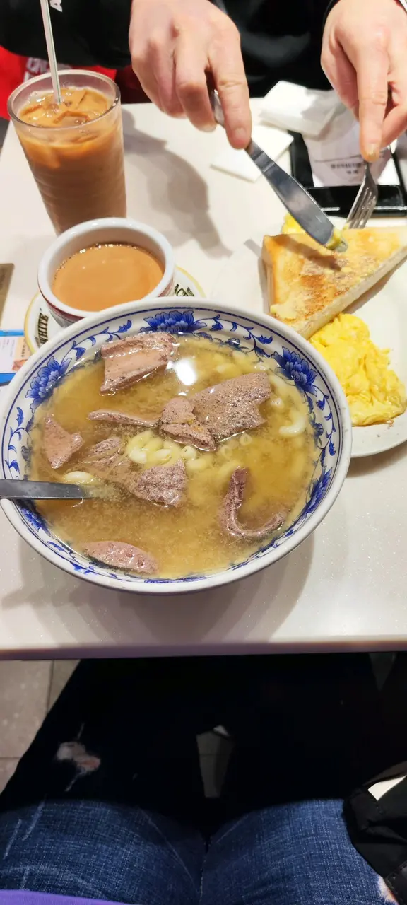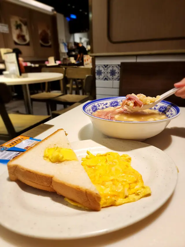 今早去食早餐, 不過d粥唔係太啱我食, 我揀左薑絲豬潤通粉, 多士炒蛋配熱奶茶, 可能附近店舖未開齊, 差唔多全場爆滿, 但初一至初七要另外加一, 等左一陣先上多士炒蛋, 多士上的牛油大舊到可以只少分三, 四次🤣, 只好整開😅味道正常唔係太差, 而且敢旺敢忙, 都不可能要求太高, 再等多一陣通粉和奶茶送到, 豬潤唔係脆亦唔係粉, 不過不失, 通粉分量都足夠, 其實可以用細少少的碗😅唔洗比敢多湯😸奶茶雖然凍左但味道也可以, 算係唔差😋家人就食粥套餐, 碎牛配炒兩加凍奶茶, 另加一只粽, 我無食到但家人說都可以查看更多