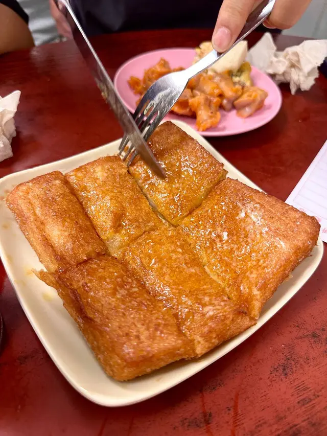 第二站就去食驰名蛋牛治。其实唔系第一次食,但系每次黎深水埗揾野食,都会记起要食佢。由于佢店面唔大,加上国庆假期,所以去到都要等一阵位,而且要搭枱。当然叫左份蛋牛治烘底。记得 记得 记得 烘底!!!另外叫左杯冻柠茶。同我同枱既4个人都系叫蛋牛治😂可见出名程度。唔洗等好耐食物就送到。香!确实系香!烘底既面包香,㶶边既碎牛蛋饼既肉香蛋香,仲有少少牛油香味。唔系要影低,一送到就已经想拎黎食🤤影完就急不及待进食,烘底多士香脆,碎牛蛋饼足料,调味适中唔会太咸,同以前食既味道一样,唔错。值得留意系设有最低消费,净系蛋牛治会争几蚊,可能要谂吓仲想食咩,或者叫杯野饮。驰名蛋牛治 $24 (烘底+$1)冻柠茶 $19…查看更多