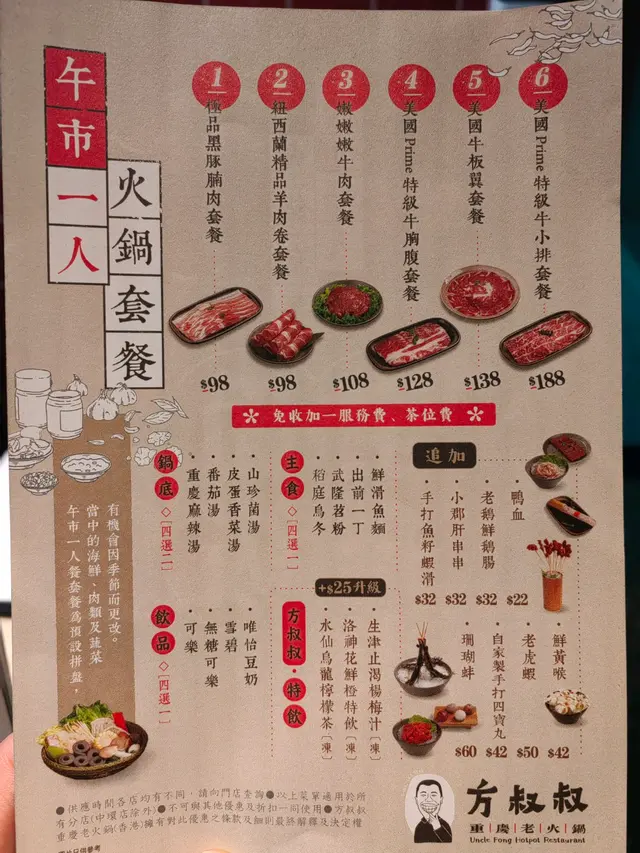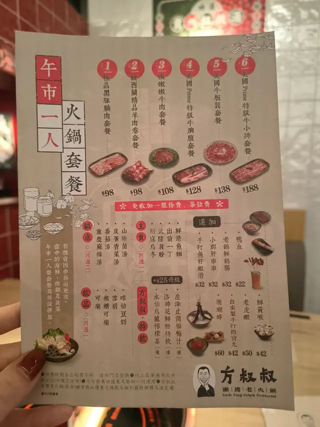 同朋友慶祝生日佢想食火鍋我就諗起「方叔叔重慶老火鍋」之前都有幾個朋友向我推介話方叔叔啲嘢食新鮮喺OpenRice見到有個抵食嘅火鍋預付套餐「溯源陳味二人餐$526」套餐包括湯底,肉類兩份,餐廳推介嘅重慶特色火鍋料、甜品、汽水、茶介醬料全包,不用加一一去到坐低,侍應就給我們冰糖雪耳糖水服務好好呢套餐包括以下:精選肉類:(四選二)有牛肉、羊肉、豚肉,我哋揀晒牛肉🐮 美國Prime特級牛胸腹(半份)🐮 嫩嫩嫩牛肉(半份) 牛肉質素普通,不過以這個價錢嚟講都ok嘅重慶特色:🐂 鮮黃喉(半份): 好爽脆,加上麻辣湯,辣得過癮🪿 老鵝鲜鵝腸(半份):鮮嫩爽口🫛 卜卜脆乾貢菜(半份):好特別嘅菜,勁爆爽脆🍜 武隆苕粉(半份):寬粉,索晒麻辣湯,正呀🦐 手打魚籽蝦滑(半份):鮮味彈牙🐂 手打香菜牛肉滑(半份):有牛肉味,質感滑🥗 田園菜籃:有金菇及幾款蔬菜🍧 甜品:冰粉(2份):有果仁加在冰粉,食完辣嘢再食,可以解辣🥤 飲品:可樂/無糖/雪碧(2份)這個套餐包含餐廳推介嘅菜式及肉類,肉類唔算好多,不過一個價錢全包價,都幾抵食!而且可以食到好幾款特色火鍋配料份量方面,男仔食的話,肉類可能唔夠不過先點套餐,再加另外散點,咁樣會抵食啲!我哋另外叫咗炸芋頭同淮山!芋頭夠粉嫩,淮山夠爽口如果想食呢個套餐,記得要先在OpenRice購買現場係點唔到呢個餐📣 餐廳而家做緊免收加一查看更多