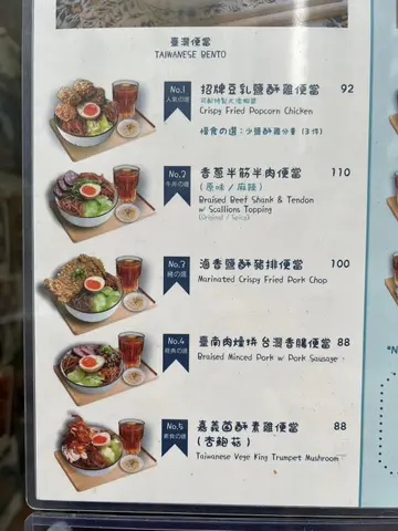 之前有朋友推介过,今次又有另一个朋友提议去冇理由唔去试吓呱😗位置喺PMQ对面,唔近地铁站,要行上半山除咗便当,仲有红烧汤面、酸辣汁伴泰式米粉、蛋饼、窝夫等最出名系豆乳盐酥鸡,不过我比较想试牛肉▶️ 前菜凉拌木耳爽口,带香蒜味,几开胃▶️ 香葱半筋半肉便当 ($110)面头有三大块牛展同四条牛筋,好足料牛展软腍腍🐂夹杂有嚼口嘅啫喱层,唔会干争争,重牛味之余卤得入味牛筋带少少韧度,唔系一pat膏咁,不过都未至于爽弹糖心蛋整得好食👍🏻蛋黄浆状,晶莹剔透另外有炒椰菜、红萝卜丝韩式炒粉丝够味而不油腻,面质弹牙最后有香葱作点缀更香口饭质唔系珍珠米,口感上差少少🍚味道来自卤水汁▶️ 无糖四季春茶 茶底香浓但不苦涩🍵-食物味道ok,𩠌菜出色,份量够足摆盘精致,打卡able比较钟意系餐厅内在环境布置😍有上下两层,上层系土耳其风,用上民族feel地毡,要除鞋坐地下同一大班朋友嚟,好似包场咁,倾偈特别有feel服务几好,侍应上菜要上落楼梯(辛苦佢哋了)但仍然保持礼貌👍🏻系上菜速度较慢,可能因为我哋多人,可体谅嘅不过卫生方面有待改善,朋友杯饮品上面有只小蚊,然后两份主食入面分别有一条头发🫢价钱以台湾菜嚟讲偏贵少少🤏🏻不过当cafe咁坐就ok嘅值得一试,尤其如果同朋友聚会🎈