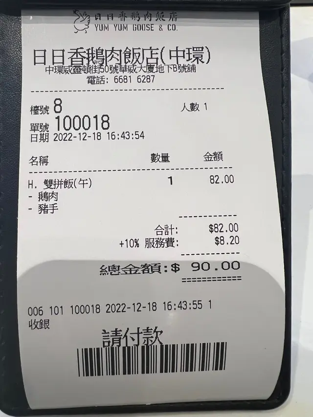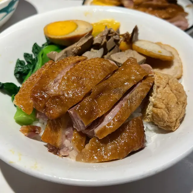 中環威靈頓街的日日香鵝肉飯店放工已經好攰,行過威靈頓街,見到呢間飯店,即刻行入去搵食。打開餐牌,好多選擇,鵝的各部位都可以下單:鵝肉,鵝掌翼,鵝腸,鵝肝….. 甚至鵝頭和鵝頸都可以下單。太肚餓未經思考叫左特選滷味飯和自選相拼飯。兩個飯和餸都好大份量特選鹵味飯有美味豬腩肉、紅腸、豆卜和豬大腸。豬腩肉和豬大腸鹵得很入味,仲有美味的滷水蛋,真係冇選擇錯。自選雙拼選擇了滷水鵝肝和豬腩肉,鵝肝甘香入味,yummy yummy.值得一提:飯很有米香,配上鹵水汁,👍👍👍餐廳環境整潔,侍應有禮。食飽飽,下次再來試其他食物。查看更多