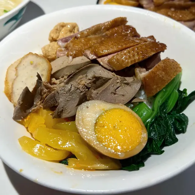 這裡提供了多種搭配,我選了滷水鵝肉拼墨魚,搭配瀨粉,並點了一份清爽的白灼菜心和口感獨特的滷水豆腐。 滷水的獨特調味讓這道拼盤更加豐富,鵝肉的質地韌勁十足,與墨魚的柔軟形成了絕妙的對比。菜品還會主動搭配滷蛋、豆卜和小鹹菜。瀨粉口感滑嫩,清爽口感和與其他食材的搭配,使得這道主食成為整頓餐點的完美補充。此外,我點了一份清脆的白灼菜心。 這道菜以新鮮的菜心為主角,輕輕燙熟后,搭配了一份簡單的調味汁。 菜心的質地保持得非常好,保持了蔬菜的鮮嫩口感,同時也為整頓餐點增添了一絲清爽的口感。最後是滷豆腐,這是一道我非常喜歡的素菜。 豆腐經過鹵水的烹製,吸收了濃郁的調味汁,口感鮮嫩。 豆腐的嫩滑與鹵水的味道相得益彰,給整個菜品增添了豐富的口感層次。查看更多