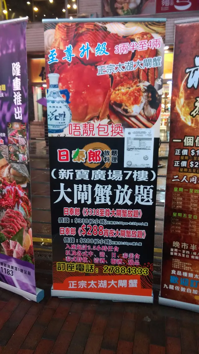 秋風起,開始有啲涼意。返工的阿姐已經開始講緊訂大閘蟹,耳濡目染下,心思思又想食。咁啱約左細佬係佐敦幫我拎野返屋企,經過條街見到大大個易拉架寫住大閘蟹放題,好吸引,決定去食返餐。其實幾年前都食過日泰郞放題一次,食物選擇都幾多,所以見佢放題有大閘蟹食,就又去試下啦。7點半入場,$338一位,可以任食2個鐘。7點幾人未算爆人,但人都唔少。汔水櫃、甜品櫃同埋食物counter算係圍住啲座位咁擺,所以拎野食幾方便。汔水除左10幾種罐裝,仲有自助飲品機,椰汁、酸梅湯等。甜品櫃都有成10種甜品,選擇算好多。食物counter有沙律吧,可自製沙律,亦有啲凍品,例如中華沙律、芝麻八爪魚同蝦。又有熱湯及糖水提供。但我地主力都係食蟹,侍應話蟹至少等20分鐘,所以一坐低就即刻order蟹黎食。但佢每次每人最多order3隻,咁未等到蟹之前都要填下肚先。先黎刺身,點左無幾耐就上枱,甜蝦大大隻,無漏單。食緊刺身,熱盤都上枱,雞軟骨、蒜蓉帶子幾好食,芝士年糕熱辣辣,咸咸地,好煙韌。羊架大大塊,燒得唔算乾。天婦羅我最鍾意個番薯仔,因為好甜,食左成5粒。放題黎講,泰式熟食算好豐富,但我地食到飽飽地,要留肚,所以只點左生蝦。生蝦隻醬料好辣,同泰國有得比。千呼萬喚,等左好耐,蟹終於上枱。橙紅色大大隻的好肥美。剪左蟹腳,揭開個蟹蓋,好大陣蟹味,蟹膏算係多,用羹挖出黎食,好似食緊奶黃咁,食完蟹黃香仲係個口停留。因為啲蟹算足両,所以啲腳都好有肉,隻隻都可拮到啲肉黎食。埋單400蚊唔使,食到飽飽,又可以瘋狂食足秤太湖大閘蟹,這大閘蟹放題值得試試!查看更多