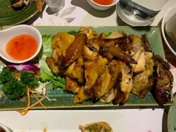 圣诞节唔想同人迫,所以揸车去呢间泰国餐厅试下我地一行5人,都叫左唔少野食,餐厅除咗泰国菜之外,仲有印度咖哩,都几多元化小食拼盘,份量都几多,可以试到唔同小食,有串烧,鸡翼,鱼饼,虾饼,春卷,虾片生虾刺身都唔平,有少少贵,味道正常椰子鸡汤,饮落有少少酸酸地,几开胃,天气冻,饮少少热汤,个人都暖返大虾金边粉,味道几好咸鱼炒芥兰,都不错明炉乌头,个摆盘都几吸引,不过条鱼唔算大条,所以都有少少贵🤣我哋叫咗蒜蓉包,为咗蒜蓉包冇咁单调,我哋叫咗牛油鸡,呢个牛油鸡反而好有惊喜,佢加咗好多蕃茄酱,食落去几惹味👍另外,榴梿沙冰都好大杯,大满足😋最后两个甜品都中规中矩如果下次元朗揾唔到停车场,都可以揸车入嚟食饭