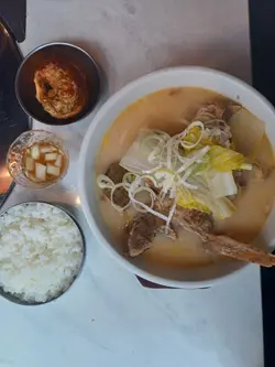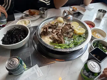 三三烤肉套餐:猪肉、3人 ($520) ★★★★✰叫烤肉的话有一位店员为我们服务,娴熟的为我们烹调所有套餐的肉类及蔬菜,虽然可能因我们食得较慢,所以部分豚肉感觉比较熟韧了一段,不过肉味很重而且没有猪臊味,配以甜辣酱+生菜或紫苏叶是很经典好食的韩式配搭。途中豚肉出太多油,店员会用面包块往炉中吸油,以致整体没有太油腻的感觉。略嫌不足的是这个套餐的份量较少,而且豚肉的部位似乎只有两款(五花腩及类似猪肩的部位),三人套餐对一般三位成年人也肯定食不饱,鸡脾菇、泡菜、葱条等蔬菜配料也不多,而且味道正常。